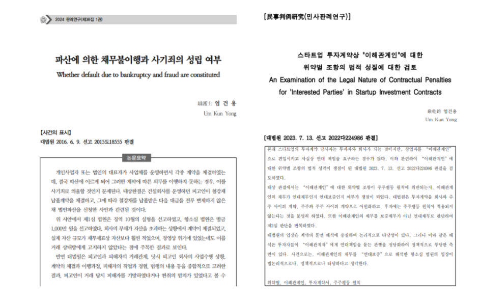 스타트업 파산을 다수 처리하다보니 대표님들이 공통으로 궁금해하는 주제들이 있었고, 그 주제들을 연구해서 소논문으로 발표하기도 했다. 파산신청을 했다가 사기죄로 처벌받는 것은 아닌지, 투자계약서상 이해관계인에 대한 주식매수청구권 또는 위약벌 청구는 언제, 어떻게 이루어지는지 여부 등을 연구했다. 그렇게 열심히 가려운 곳을 긁어드리다보니, 기존의 대표님들로부터 어려움에 처한 다른 회사를 소개받기도 하고, 나쁜 투자자(?)들의 겁박(?)으로 잠 못 이루던 대표님들의 걱정을 덜어드릴 수도 있었다.
