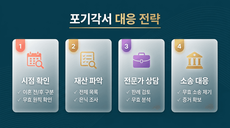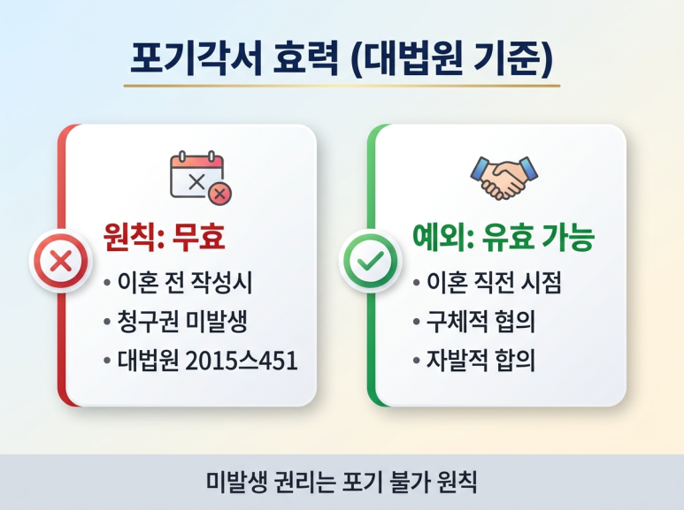 포기각서를 작성한 시점이 이혼 전인지 이혼 후인지 확인합니다. 이혼 전이라면 대법원 판례에 따라 원칙적으로 무효입니다.