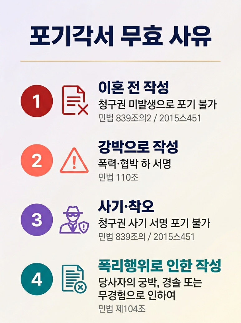 포기각서를 쓰기 전이라면, 반드시 이혼 전인지 후인지 확인하세요. 이혼 전이라면 서명하지 마세요. 이미 썼다면 작성일과 이혼신고일을 대조하세요.