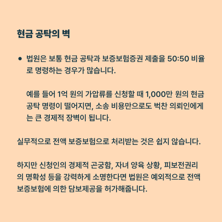 현금 공탁 vs 보증보험: 법원은 보통 현금 공탁과 보증보험증권 제출을 50:50 비율로 명령하는 경우가 많습니다. 예를 들어 1억 원의 가압류를 신청할 때 1,000만 원의 현금 공탁 명령이 떨어지면, 소송 비용만으로도 벅찬 의뢰인에게는 큰 경제적 장벽이 됩니다.
