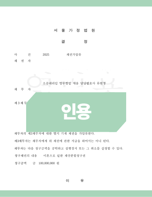 현금 공탁 없는 가압류 전략: 실무적으로 전액 보증보험으로 처리받는 것은 쉽지 않습니다. 하지만 신청인의 경제적 곤궁함, 자녀 양육 상황, 피보전권리(받아야 할 돈)의 명확성 등을 강력하게 소명한다면 법원은 예외적으로 전액 보증보험에 의한 담보제공을 허가해줍니다.
