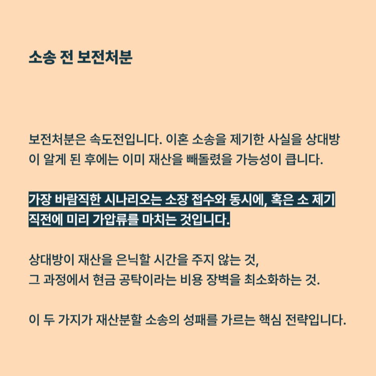 보전처분은 속도전입니다. 이혼 소송을 제기한 사실을 상대방이 알게 된 후에는 이미 재산을 빼돌렸을 가능성이 큽니다. 가장 바람직한 시나리오는 소장 접수와 동시에, 혹은 소 제기 직전에 미리 가압류를 마치는 것입니다.