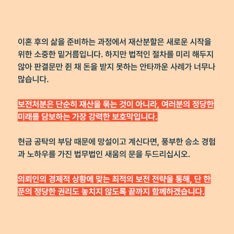 이혼 후의 삶을 준비하는 과정에서 재산분할은 새로운 시작을 위한 소중한 밑거름입니다. 하지만 법적인 절차를 미리 해두지 않아 판결문만 쥔 채 돈을 받지 못하는 안타까운 사례가 너무나 많습니다. 보전처분은 단순히 재산을 묶는 것이 아니라, 여러분의 정당한 미래를 담보하는 가장 강력한 보호막입니다.