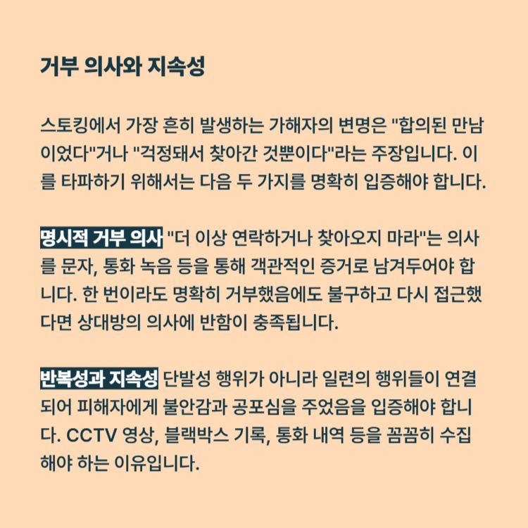 스토킹 고소에서 가장 흔히 발생하는 가해자의 변명은 "합의된 만남이었다"거나 "걱정돼서 찾아간 것뿐이다"라는 주장입니다. 이를 타파하기 위해서는 다음 두 가지를 명확히 입증해야 합니다.