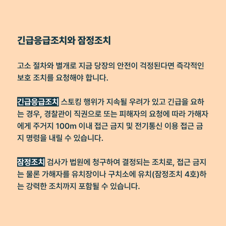 잠정조치: 검사가 법원에 청구하여 결정되는 조치로, 접근 금지는 물론 가해자를 유치장이나 구치소에 유치(잠정조치 4호)하는 강력한 조치까지 포함될 수 있습니다.