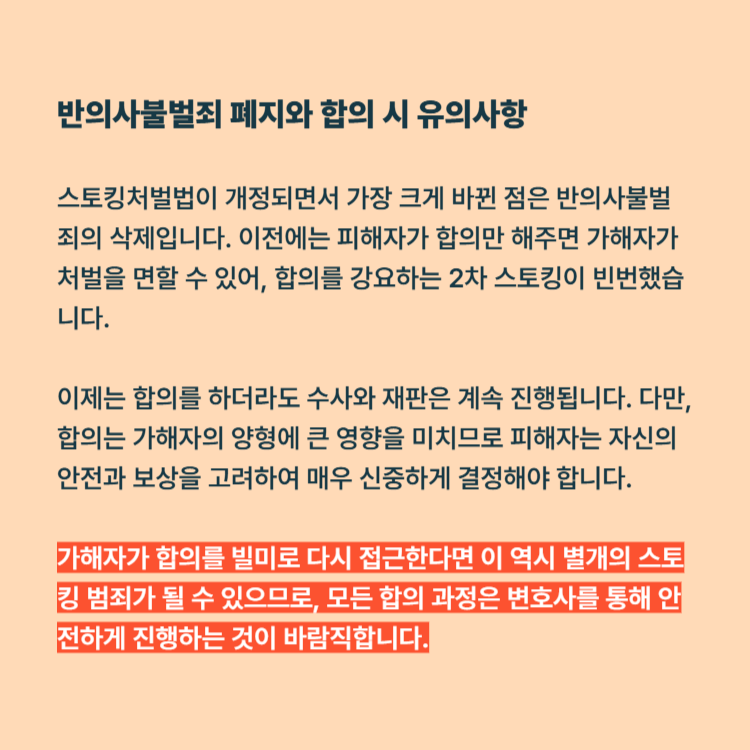 스토킹처벌법이 개정되면서 가장 크게 바뀐 점은 반의사불벌죄의 삭제입니다. 이전에는 피해자가 합의만 해주면 가해자가 처벌을 면할 수 있어, 합의를 강요하는 2차 스토킹이 빈번했습니다.