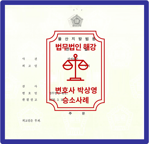 저희 법무법인 해강은 법리적인 검토를 통하여 의뢰인 상황에 맞춘 변호인 의견서 등 작성을 통하여 의뢰인을 위해 최선을 다하였고 이에 [무죄]를 이끌어냈습니다.