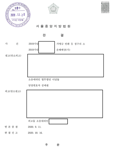 가맹금 반환청구는 가맹사업 해당여부, 가맹사업법 적용여부, 정보공개서 미제공 / 허위과장 정보 해당여부, 계약일로부터 4개월 이내에 가맹금의 반환청구(적법요건에 맞게) 등 일련의 절차를 잘 이해하고 있는 전문가의 도움을 받으시는 것이 좋습니다. 저 역시 그 중의 한사람이라 생각합니다. 선고되고 1년이 넘는 기간동안 함께 마음고생을 했던 의뢰인 분과 기쁜 소식을 나누었습니다.