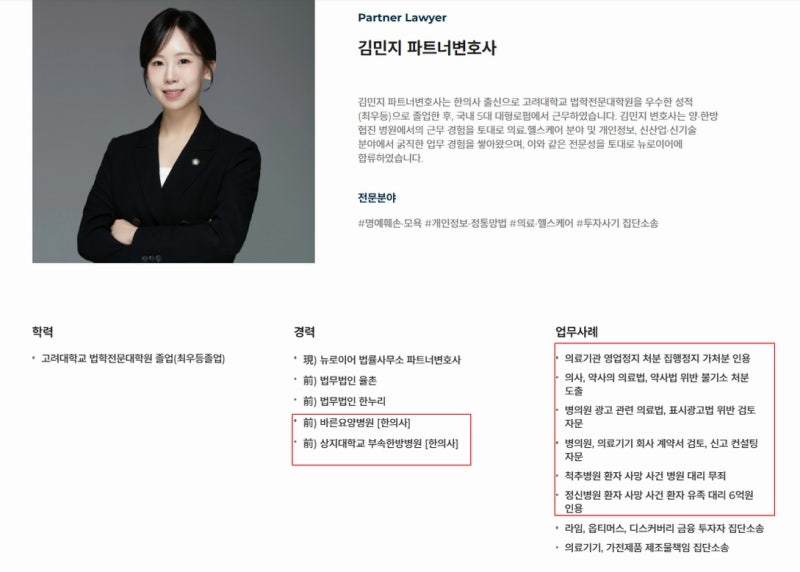 뉴로이어 법률사무소 의료 헬스케어 팀 담당 한의사 출신 김민지 파트너변호사님: )