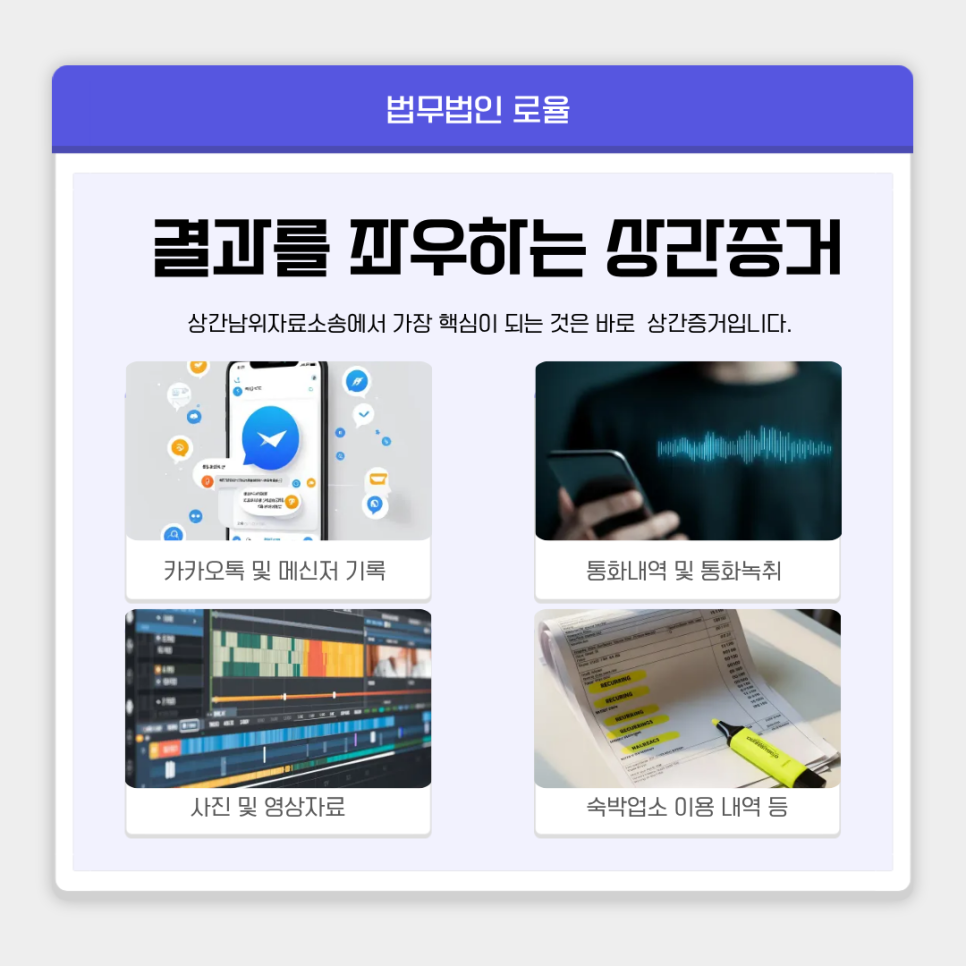상간소송상담 초기 단계에서 반드시 확인해야 하는 핵심 요소라고 보시면 됩니다.