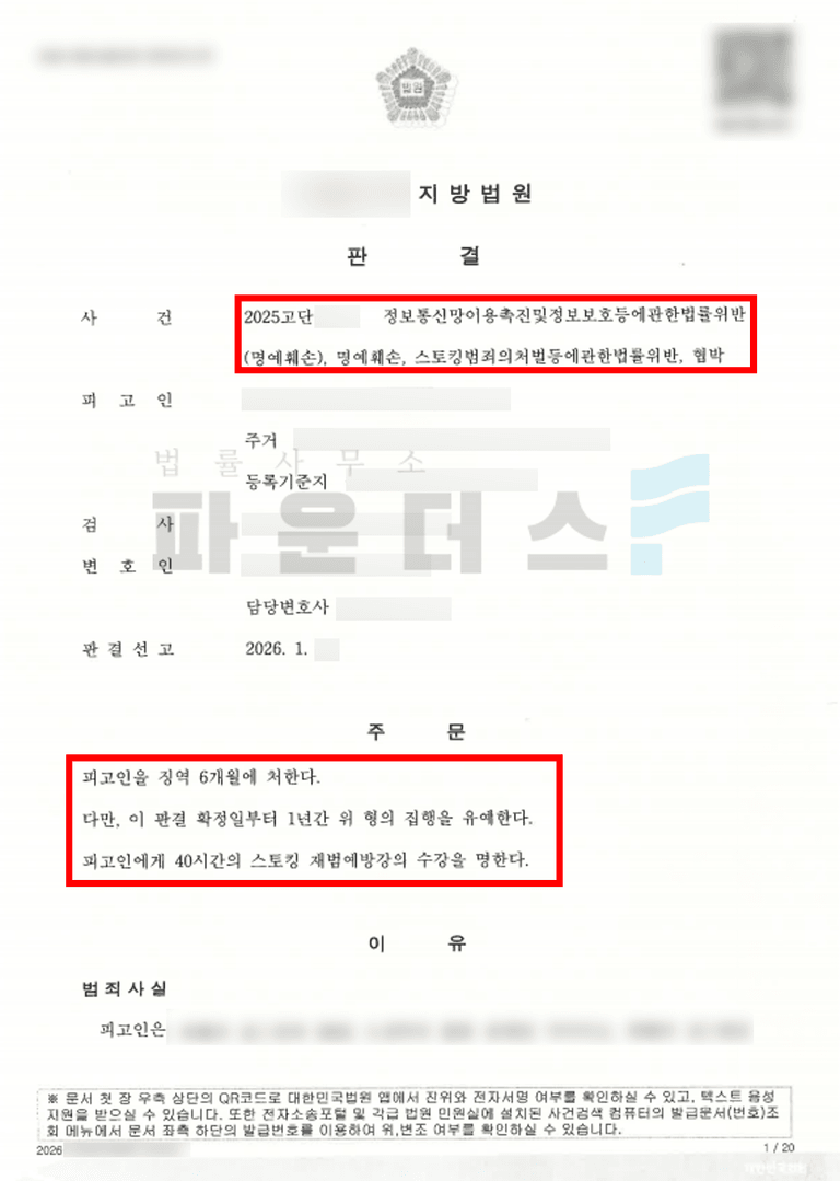 이와 같은 과정으로 사건의 핵심이 명확히 전달되었고 A 씨의 반복적인 범행이 중대하게 인정되어 A 씨는 정보통신망법상 명예훼손, 형법상 명예훼손, 협박, 스토킹 혐의에 대해 징역 6개월에 집행유예 판결을 받게 되었습니다.