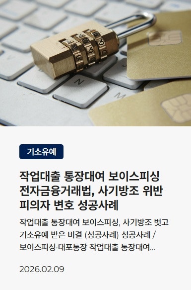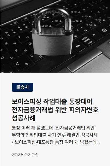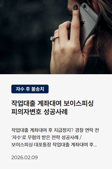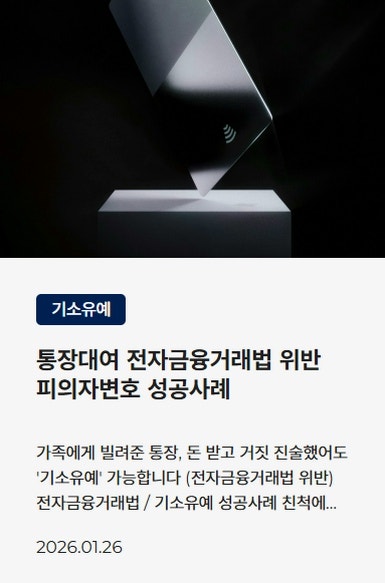 ![[보이스피싱]대포통장대여 초범 처벌 수위는? 경찰조사 대응방법](/_next/image?url=https%3A%2F%2Fd2ai3ajp99ywjy.cloudfront.net%2Fuploads%2Ftitleimage%2Foriginal%2F5d1e2beca414e653c9c8cc7e-original.jpg&w=3840&q=75)
