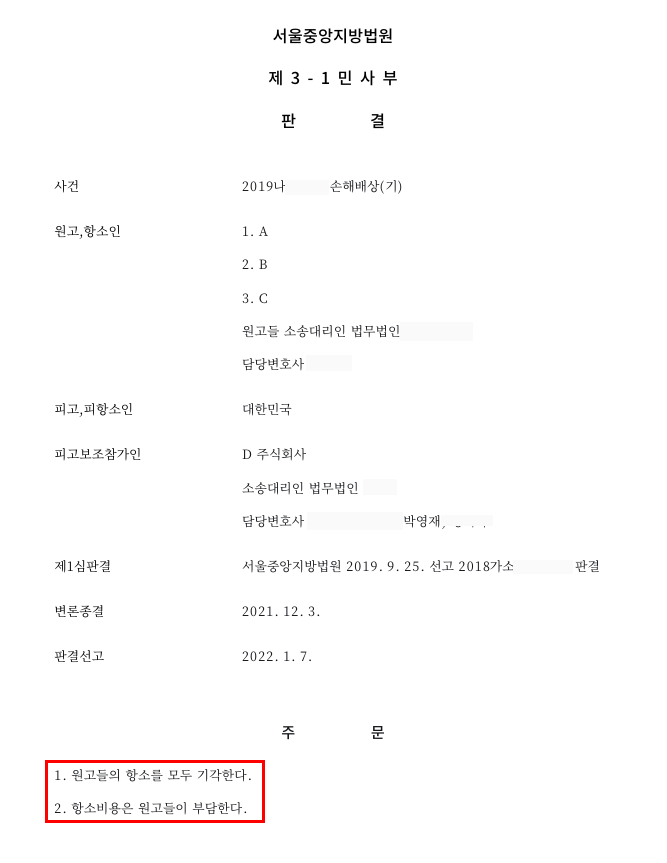 ⑤판결 : 법원은 손해 발생의 원인이 피고의 과실이 아니라 원고 측 요청에 따른 설치에 기인한 것으로 보아 손해배상 책임을 부정하고, 원고들의 항소를 모두 기각하였습니다.