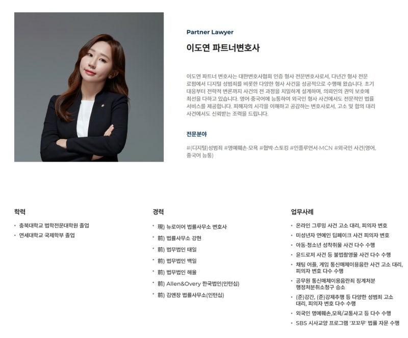 뉴로이어 법률사무소의 이도연 파트너변호사님입니다.