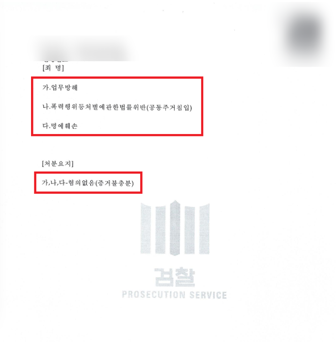 검찰은 저의 변호인 의견서를 면밀히 검토한 끝에, 세 가지 혐의 모두에 대해 '혐의없음(증거불충분)' 불기소 처분을 내렸습니다.