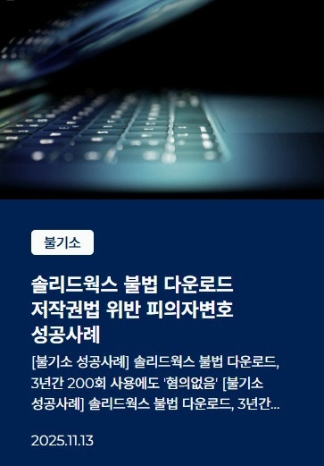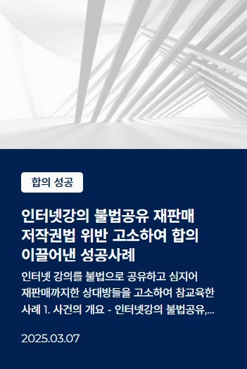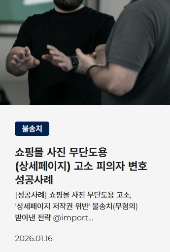 한편 최근 실무 동향을 살펴보면 쇼핑몰 이미지 저작권 침해로 리셀러분들을 상대로 한 대량 고소가 매우 빈번하게 이루어지고 있는 상황입니다. 따라서 억울하게 고소를 당하셨다고 해서 두려움에 휩싸여 상대방이 요구하는 합의금을 서둘러 지급하기보다는, 이 성공사례와 같이 초기 경찰 조사 단계부터 사실관계를 정리하고 법리적으로 차분히 대응하는 것이 무엇보다 중요합니다.