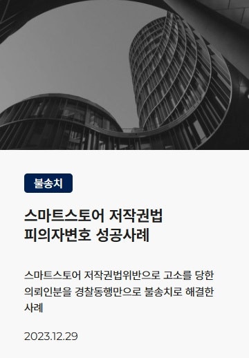 이처럼 저희는 사건의 사실관계와 법리적 쟁점을 하나씩 정리해 수사기관에 차분하게 설명해 나갔습니다. 그 결과 수사기관 역시 저희의 주장에 충분한 타당성이 있다고 판단하였고, 의뢰인께서는 경찰 수사 단계에서 저작권법 위반에 대해 불송치(혐의 없음) 처분을 받게 되었습니다.