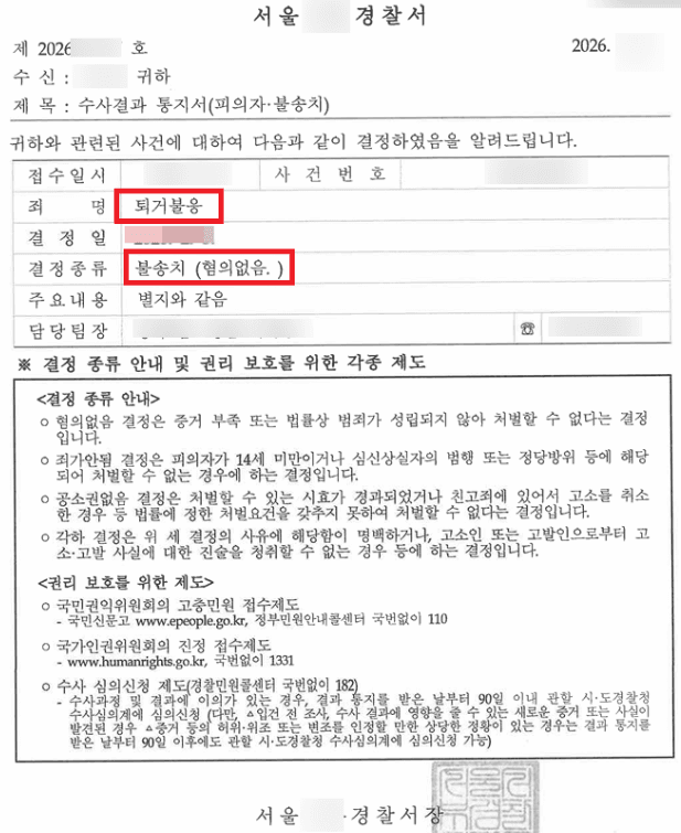 결과적으로 수사기관은 의뢰인의 퇴거불응 혐의에 대하여 '혐의없음(증거불충분)' 처분을 내렸습니다.