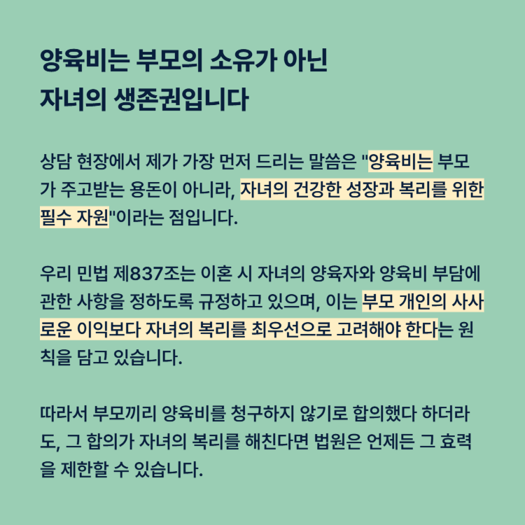 따라서 부모끼리 양육비를 청구하지 않기로 합의했다 하더라도, 그 합의가 자녀의 복리를 해친다면 법원은 언제든 그 효력을 제한할 수 있습니다. 부모가 자녀의 권리 자체를 대신 포기해버리는 행위는 법적 정당성을 인정받기 어렵기 때문입니다.