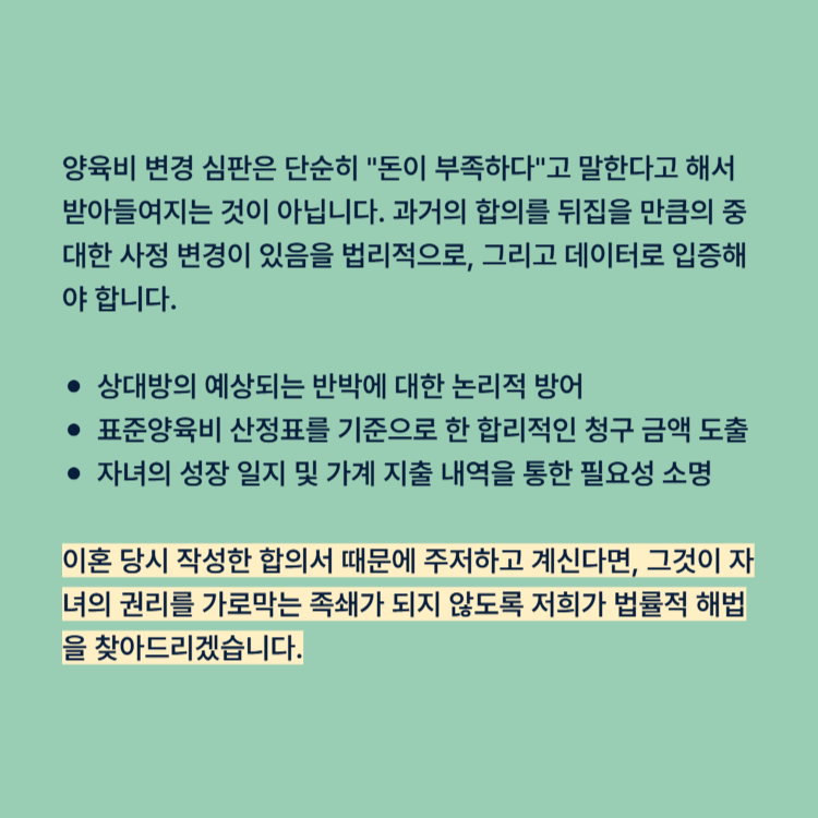 양육비 변경 심판은 단순히 "돈이 부족하다"고 말한다고 해서 받아들여지는 것이 아닙니다. 과거의 합의를 뒤집을 만큼의 중대한 사정 변경이 있음을 법리적으로, 그리고 데이터로 입증해야 합니다.