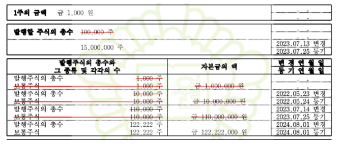 [실제 법인등기부에 기재되는 액면가, 발행할 주식의 총수, 발행주식총수, 자본금 사항]