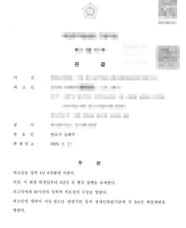 이는 ‘아청법’이 아닌 일반 ‘형법’상 강제추행 혐의만 인정된 후, ▲피해자와의 합의, ▲진지한 반성, ▲범행의 우발성, ▲재범의 위험성이 없다는 점 등 다양한 양형자료를 종합적으로 제출하여 얻어낸 최선의 결과였습니다.