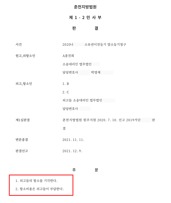 ⑤판결 : 법원은 종중총회 결의가 적법하고 이에 따른 등기 역시 유효하지 않다고 판단하여 말소청구를 인용한 제1심 판단이 정당하다고 보았습니다. 결국 피고들의 항소는 기각되었고, 의뢰인은 전부 승소하였습니다.