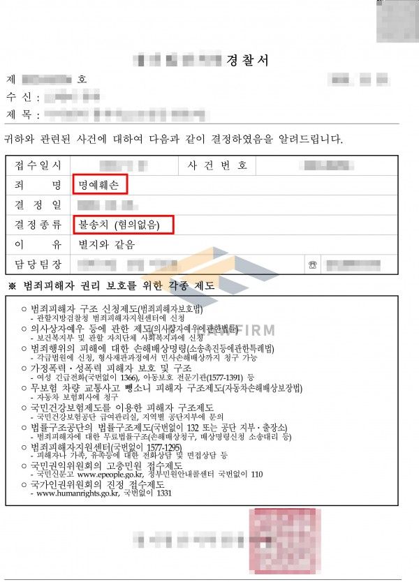 그에 따라 명예훼손 사건에서 경찰불송치*무혐의 처분 등을 도출해 내었던 다수의 사례는 물론, 피해자 측 고소대리를 진행하여 의뢰인이 만족할 만한 결과를 이끌어 내었던 사례 역시 보유하고 있습니다.