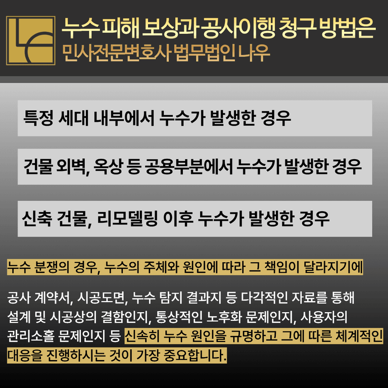 누수 분쟁은 공사계약서, 시공도면, 누수탐지결과지 등 다각적인 자료를 활용하여 설계 및 시공상의 결함인지, 통상적인 노후화 문제인지, 사용자 내지 건물관리주체의 부주의로 인한 문제인지 신속히 누수 원인을 파악하고 원인에 따른 대응을 진행하시는 것이 가장 중요합니다.