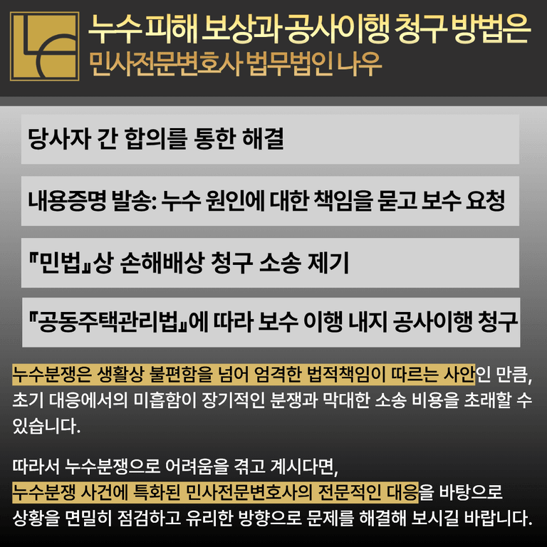 누수분쟁은 일상 속 불편함을 넘어 법적 책임이 따를 수 있는 사안인 만큼, 초기대응에 따라 사건 전반의 흐름이 바뀔 수 있습니다.