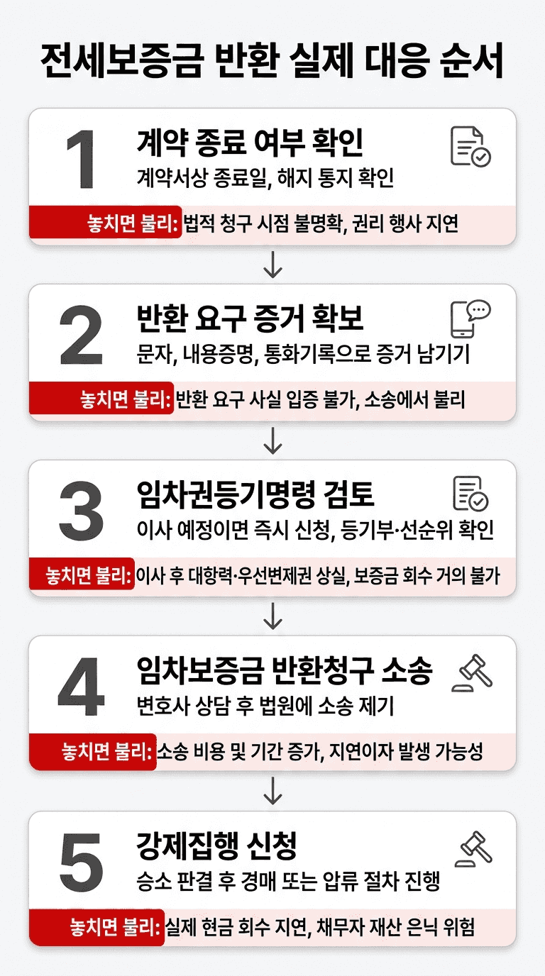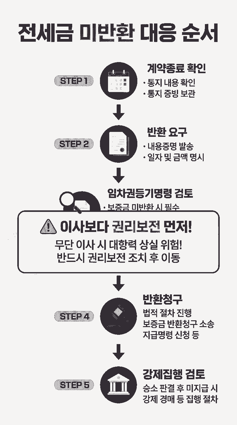 전세보증금을 돌려받지 못했다면, 이사 여부보다 먼저 임차권등기명령 가능성, 권리보전, 증거 정리, 반환청구 순서를 점검해야 합니다. 전세보증금 미반환은 단순히 “돈을 못 받았다”는 문제로 끝나지 않습니다. 실제 분쟁에서는 이사 시점, 점유 유지 여부, 대항력, 확정일자, 임차권등기명령, 선순위 권리관계가 함께 얽힙니다.