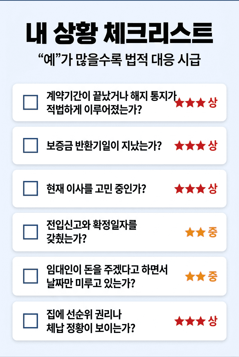 상담 전에는 계약 종료 시점과 전입·확정일자, 등기부 상태를 먼저 정리하는 편이 좋습니다.