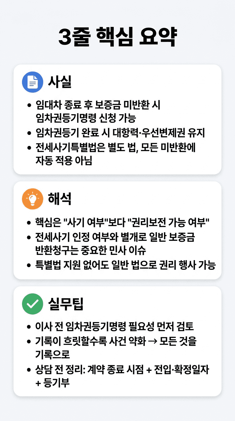 한편 전세사기피해자법은 별도의 특별구제 체계입니다. 임차권등기명령 신청과 그에 따른 임차권등기와 관련하여 든 비용을 임대인에게 청구할 수 있습니다. 따라서 전세사기 피해자로 인정되지 않았다고 해서 일반적인 반환청구까지 막히는 것은 아닙니다. 반대로 단순 미반환 사건이라고 해서 곧바로 특별법상 지원 대상이 되는 것도 아닙니다.