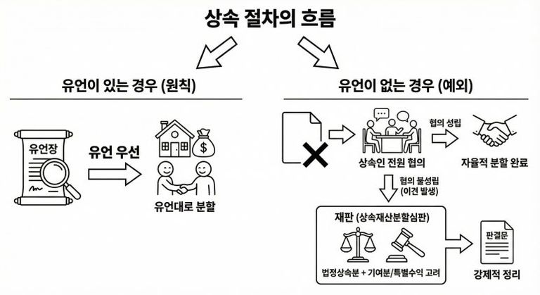 그러나 유언이 없거나, 유언이 있더라도 집행 과정에서 상속인 사이에 이견이 생기면 결국 상속재산분할협의가 핵심 절차가 됩니다.