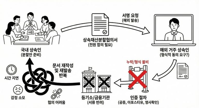 이 과정에서 해외 상속인이 서명에 응하더라도, 공증·아포스티유·영사확인 등 국내 효력을 위한 인증 절차가 누락되거나 문서 형식이 맞지 않아, 등기소나 금융기관 단계에서 서류가 반려되는 일이 빈번하게 발생합니다.