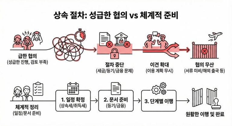 정우람 변호사의 실무 경험상, 이 유형은 "의견 차이"보다도 절차·서류·세금의 설계 실패로 협의가 원만하게 성립되지 않는 경우가 더 많습니다.
