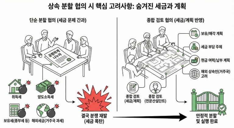 상속세만을 기준으로 분할안을 마련할 경우 이후 집행 단계에서 취득세, 양도소득세, 보유세(종합부동산세 등) 문제가 뒤늦게 드러나 협의 내용이 다시 흔들리는 경우가 적지 않습니다.