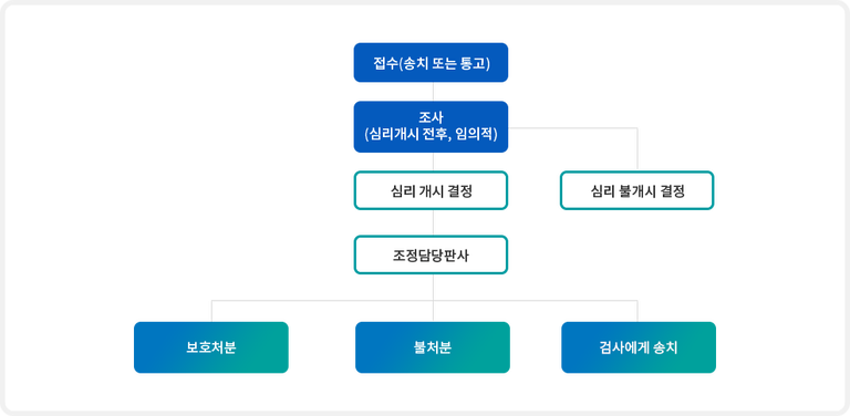 일반적으로 소년 사건은 다음과 같은 단계로 진행됩니다.