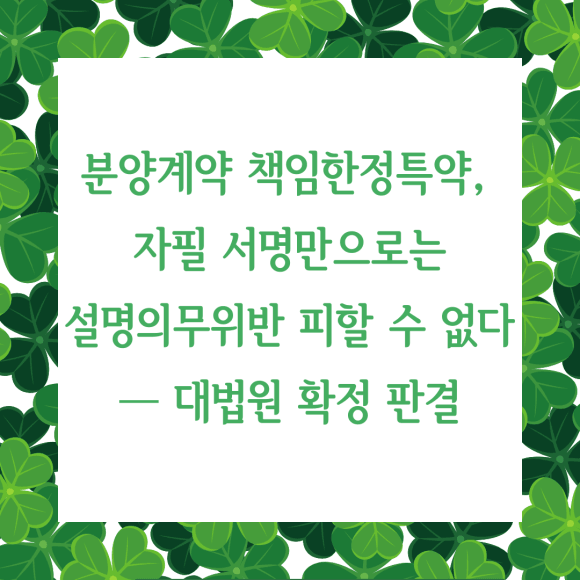 저는 분양분쟁을 전담하면서 이 문제를 계속 제기해 왔습니다. 포괄적인 서명란 하나가 법적으로 복잡하고 수분양자에게 결정적인 불이익을 주는 책임한정특약에 대한 '설명'을 대체할 수 없으며, 이는 명백한 설명의무위반이라는 주장을 소송 과정에서 거듭 펼쳐왔습니다. 그리고 2026년 2월 26일, 대법원이 마침내 이 입장을 정면으로 수용하는 판결을 선고하였습니다.