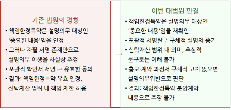 즉 서명란의 존재 자체는 '어떤 설명이 이루어졌는지'를 담보하지 못합니다. 수분양자 입장에서는 분양계약 전반에 관한 포괄적 확인을 한 것일 뿐, 책임한정특약의 의미와 효과를 고지받았다고 볼 수 없습니다. 이는 곧 설명의무위반에 해당한다는 것이 법원의 판단입니다.