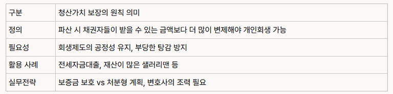 즉, 회생을 통해 갚는 돈이 파산했을 때 채권자가 받을 수 있는 금액(청산가치)보다 많아야 한다는 원칙입니다. 이것이 바로 청산가치 보장의 원칙입니다.