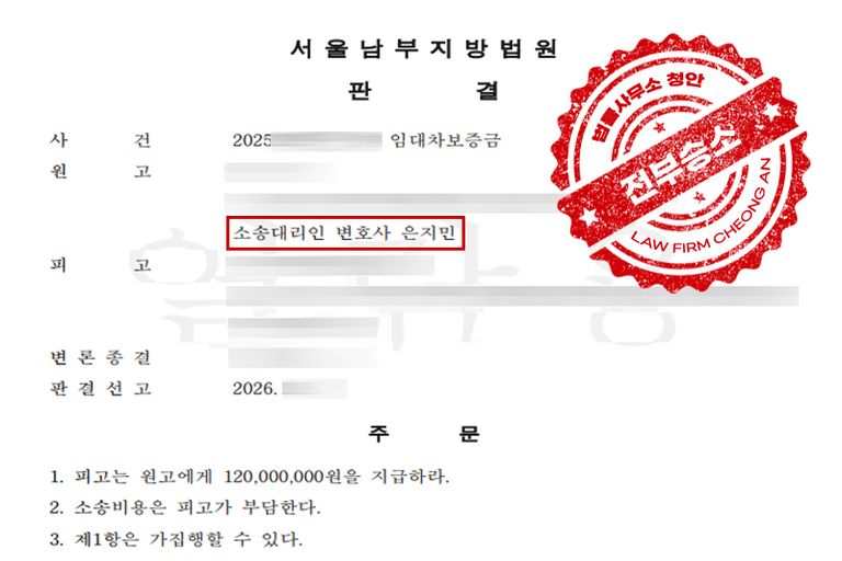 승소 판결 이후에도 본 사무소는 임대인을 상대로 지속적인 압박 절차를 진행하였고, 그 결과 임대인은 미지급한 임대차보증금 1억 2천만 원 전액과 소송비용 일체를 의뢰인에게 모두 반환하였습니다.