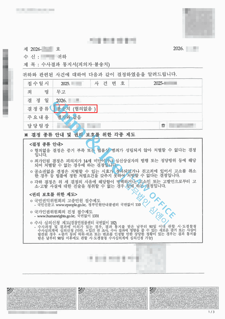 - 담당 수사관은 사건을 종합적으로 검토한 끝에, 의뢰인의 진술과 심앤이가 제출한 의견서 내용을 받아들여 무고 혐의에 대해 불송치 결정을 내렸습니다.