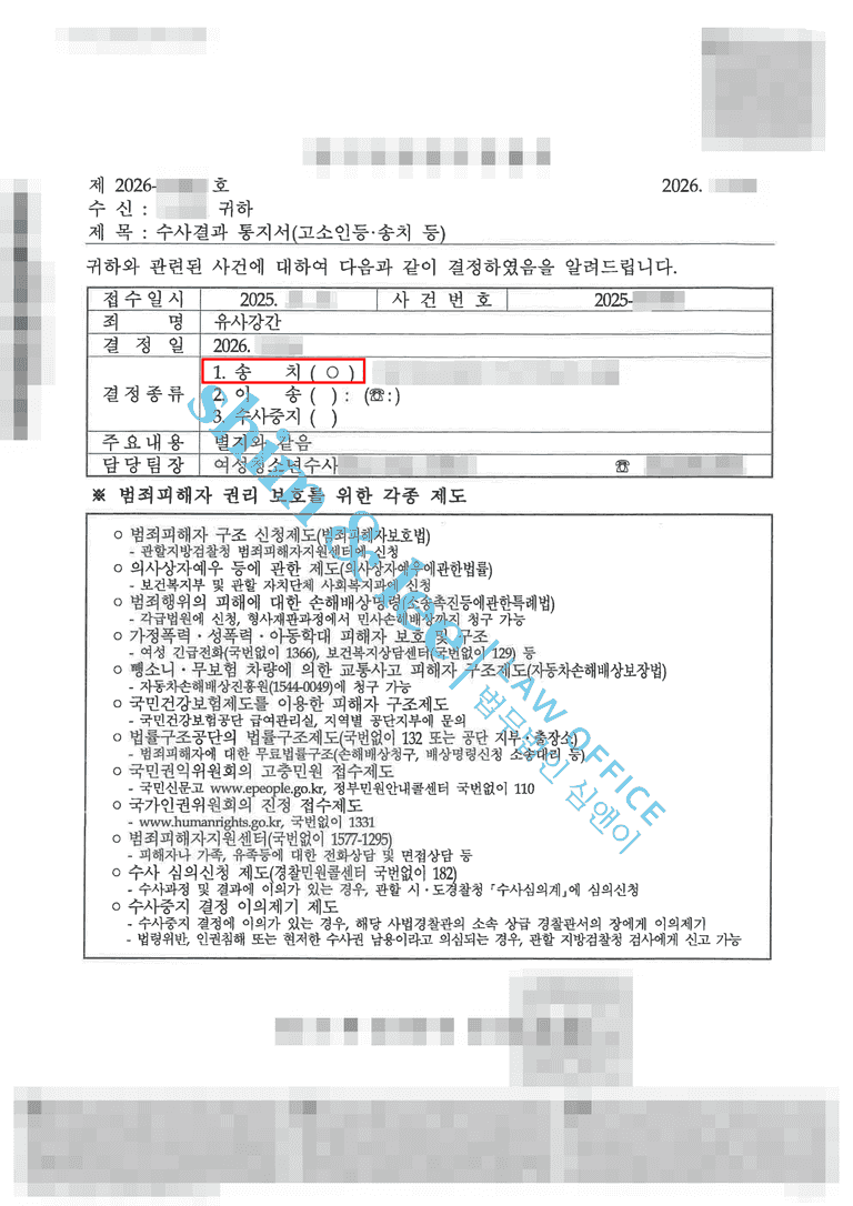 - 의뢰인은 홀로 경찰에 신고하고 조사까지 받았으나 진술을 뒷받침할 객관적인 정황증거를 하나도 제출하지 못한 상태였습니다. 이에 심앤이는 즉시 수사기관에 선임계를 제출하고 담당 수사관과의 소통을 시작하는 한편, 정보공개청구를 통해 진술서, 진술조서를 확보하여 진행상황과 보완이 필요한 부분을 꼼꼼히 파악하였습니다.