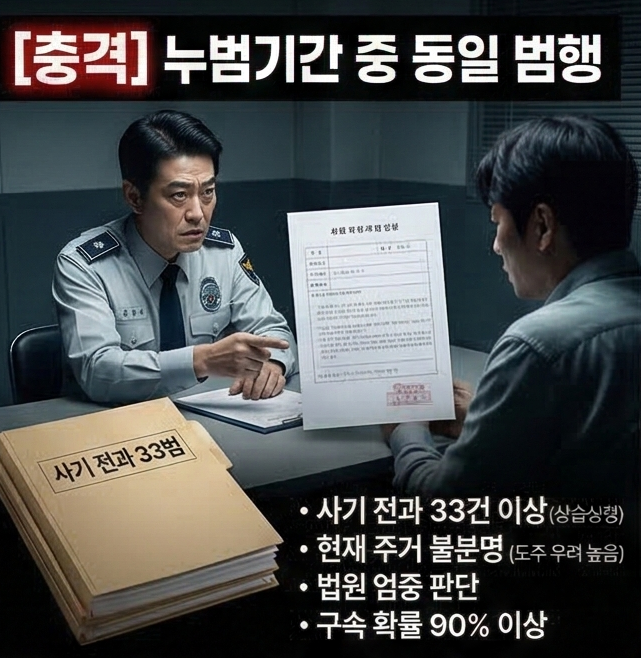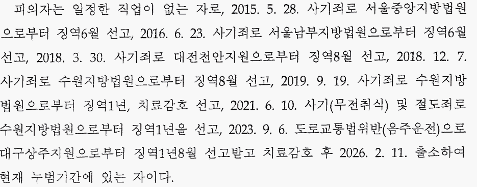 의뢰인은 2015년 부터 2026년까지 33건의 사기전과가 있었고, 알콜중독으로 인한 상습사기를 치료하기 위해 치료감호를 마친 후 2026. 2. 11. 출소하였습니다. 그런데 출소 후 단 7일만에 22,000원의 음식을 결제하지 않아 현행범으로 체포되었습니다.