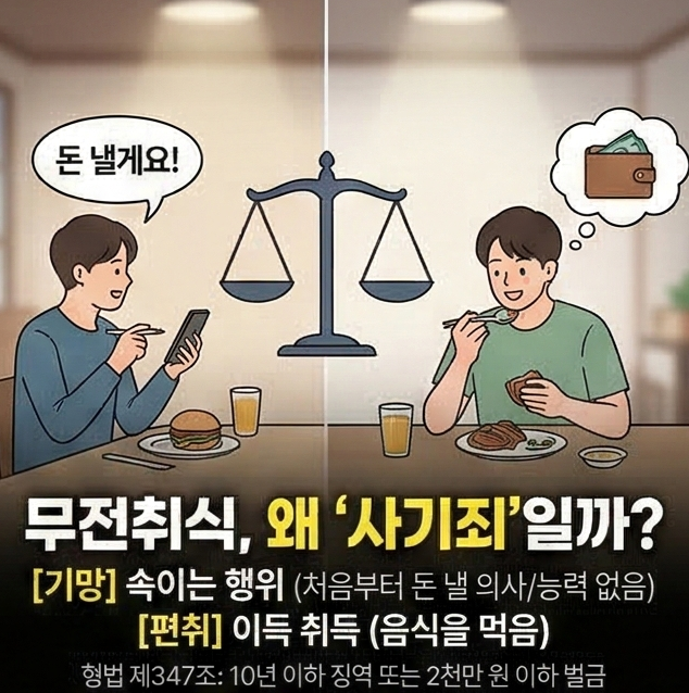 식당에서 돈을 내지 않고 나오는 무전취식 정도는 범죄가 아닌 것으로 생각하기 쉽습니다. 하지만 무전취식은 엄연한 사기죄입니다. 식당에 들어가서 음식을 주문하는 행위에는 '음식을 다 먹고 나서 대금을 지불하겠다.'는 약속이 포함되어 있는데, 처음부터 돈을 낼 생각이 없음에도 음식을 주문하여 먹었다면 이는 식당 주인을 속인 것이기 때문입니다.