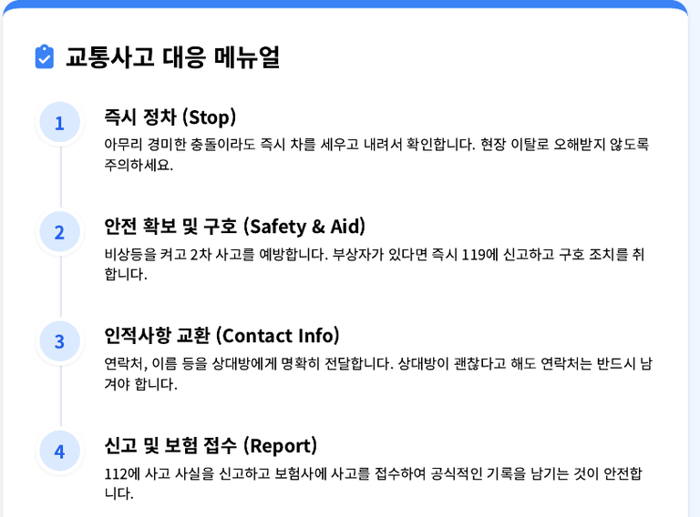 - 차량 간 충돌, 보행자 접촉, 주차 차량 손상 등 모두 포함됩니다.