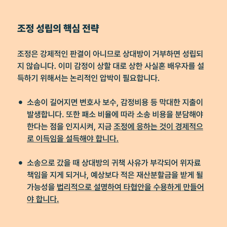 조정은 강제적인 판결이 아니므로 상대방이 거부하면 성립되지 않습니다. 이미 감정이 상할 대로 상한 사실혼 배우자를 설득하기 위해서는 단순히 "양보해달라"는 호소보다는 "소송으로 가는 것이 당신에게 훨씬 불리하다"는 논리적인 압박이 필요합니다.