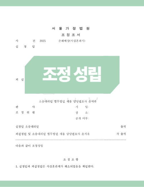 문제는 이미 마음이 떠난 상대방과 재산을 두고 법적 공방을 벌이는 과정이 당사자에게 엄청난 정신적 스트레스와 시간적 낭비를 초래한다는 점입니다. 만약 사실혼 관계를 정리하며 발생하는 분쟁을 가장 빠르고 깔끔하게 끝내고 싶다면, 확정판결과 동일한 효력을 가지면서도 유연한 합의가 가능한 조정 절차를 적극 활용해야 합니다.