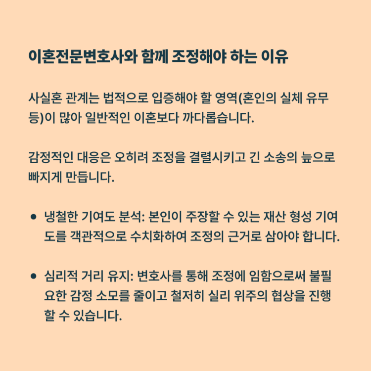 사실혼 관계는 법적으로 입증해야 할 영역(혼인의 실체 유무 등)이 많아 일반적인 이혼보다 까다롭습니다. 감정적인 대응은 오히려 조정을 결렬시키고 긴 소송의 늪으로 빠지게 만듭니다.